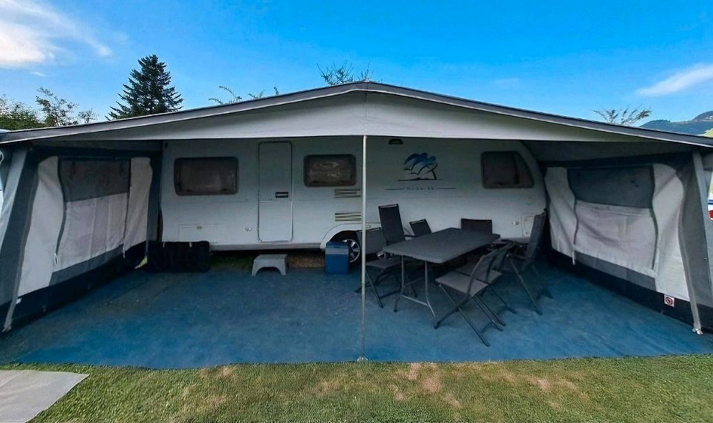 Mit dem Kauf des Wohnwagens haben wir gleich die Chance genutzt, dass Vorzelt "California" (Holiday - Heinz & Linse) (Link zu https://holiday-heinz-linse.de/) mit zu erwerben. Uns hat die Vergangenheit gezeigt, dass wir diesen zusätzlichen "überdachten" Platz (über die gesamte Länge) für die regnerischen Tage und die Auslagerung unserer Ausstattung benötigen. Darin bauen wir den Esstisch samt Stühle sowie ein Außen-Sidebord auf.